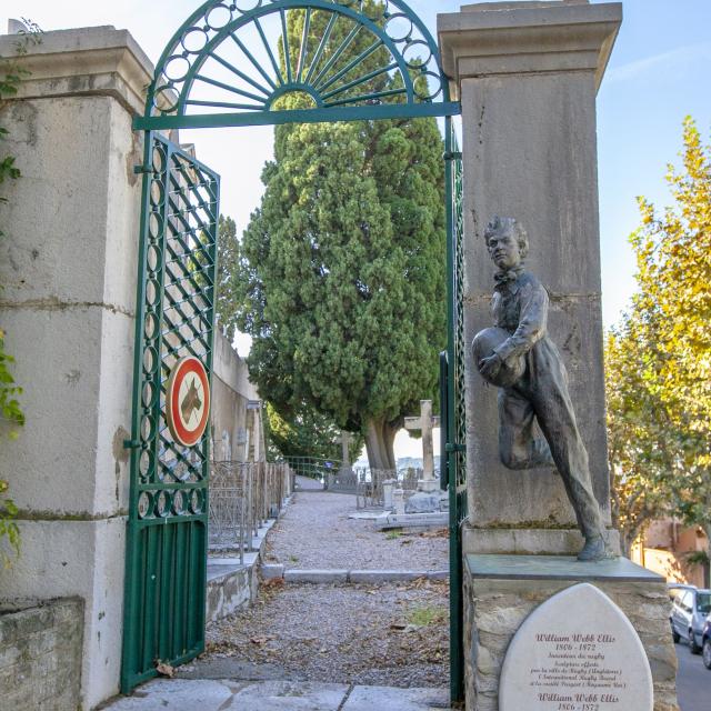 A bronze statue donated by Rugby Council portrays him in his famous pose at the lower entrance to the cemetery.