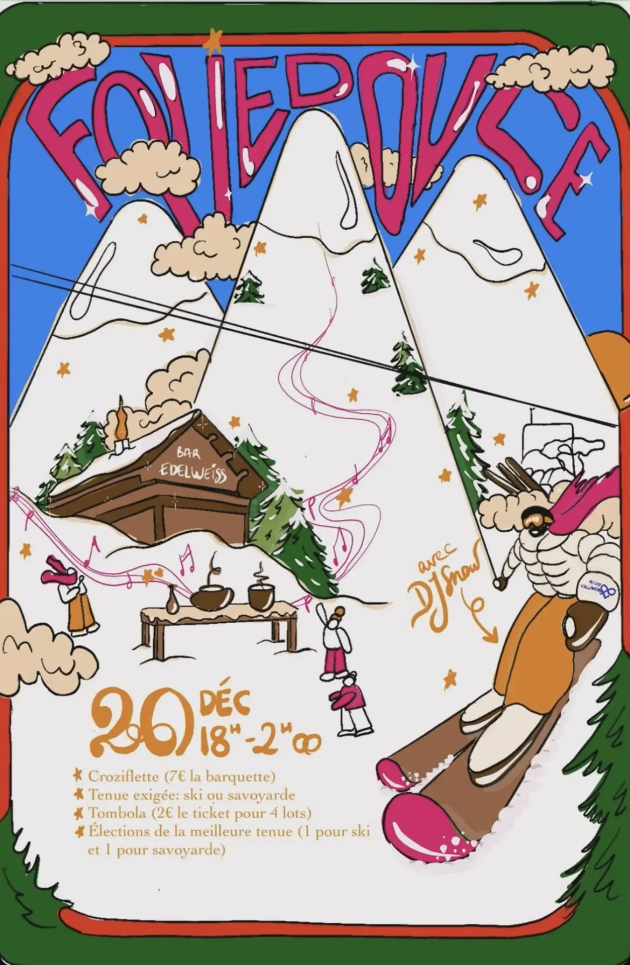 Come and experience the magic of a "Folie Douce" evening: a unique concept celebrating the festive spirit of après-ski! On the program: an electrifying atmosphere punctuated by upbeat music, perfect for dancing and relaxing. An exciting tombola awaits you, with lots of prizes to be won. The evening culminates in the election of the best ski and Savoyard outfit. Get ready to compete in originality and style! Join us for an unforgettable night of fun and conviviality.